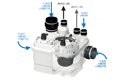 • 進水接口:40/50MM入水口(1個); 40/50/100/110MM入水口(3個)